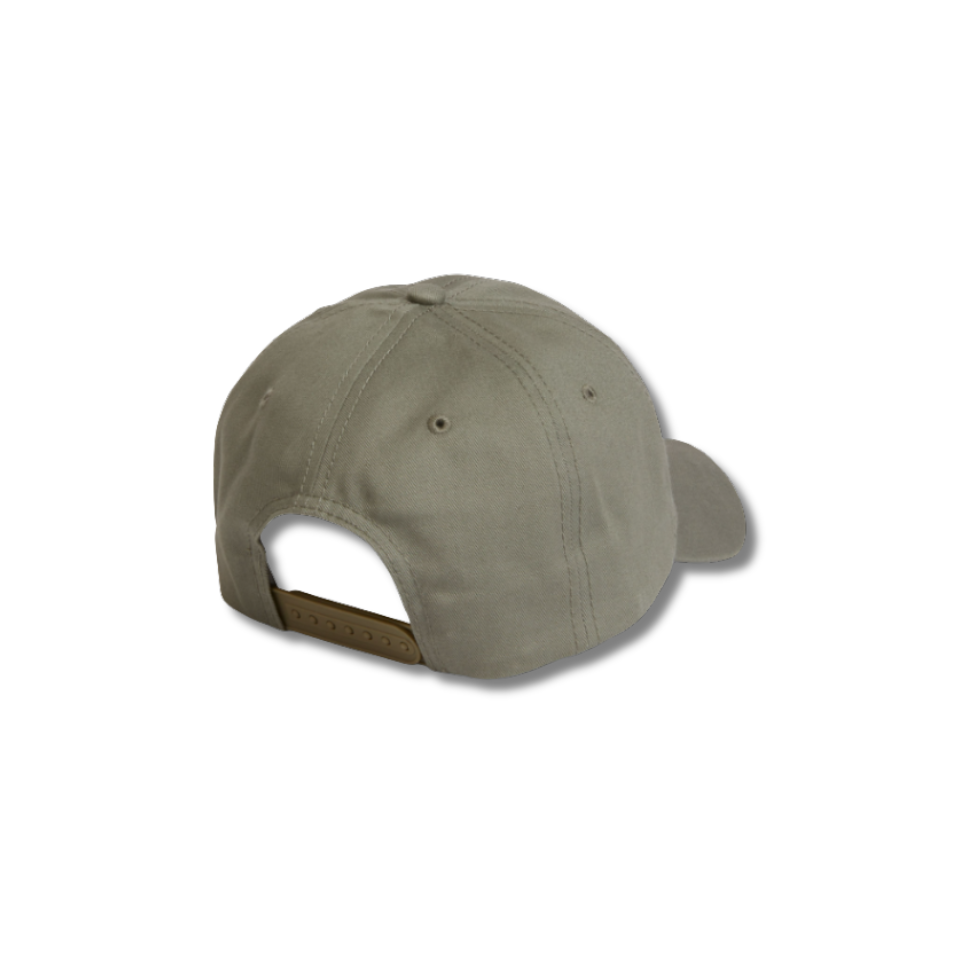 Unstructured chino cotton twill, low-profile peak, cut-and-sew visor swoop, bill stripes, and adjustable plastic snap closure. Embroidered logo. Olive.